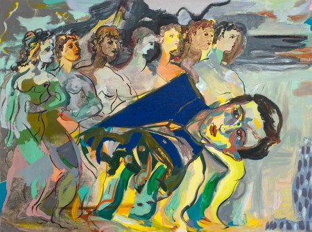 New paintings in the exhibition depict archers, views of bustling crowds framed through abstract geometries or broken waves, and at the "high water mark", the repeated image of a woman carrying a man (later a man carrying a woman, and a woman carrying a woman) through waist-high waters. As in Gendel's previous portraits, a change of gender or historical location may occur in a sleight-of-hand gesture of the brush, entire compositions lifted from art historical motifs may be repeated. Characters within Gendel's narrative "revenge of the same" change roles between protagonists, victims and spectators, in addition to changing gender, ethnicity and origin.