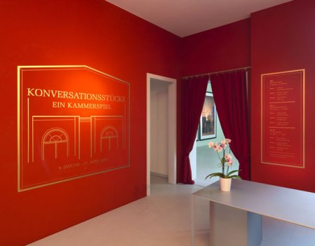 The chamber-play premise for Conversation Pieces in part arises from the gallery�s proximity to one of Germany�s most important theater, the Deutsches Theater. Artifacts such as posters, program booklets and performance photographs of historically important chamber plays performed at the Deutsches Theater since its inauguration in 1883 will also be on view in the gallery. The exhibition is also a response to the gallery architecture: an intimate, 19th-century residential building featuring a noble facade, generous salons, and large backyards that are characterized by simplicity and functionality. The historical origins of the chamber play coincide with the architectural style of the building, both reflecting a growing focus at the time on domesticity and introspection.