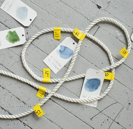 The resulting work is a 120-foot long rope – the rope Finch used in the soundings, and the artist's description of the depth of Walden Pond. It serves as the physical record of the findings as well as an armature: paper tags for each of the approximately 700 soundings appear along the rope at their equivalent measure of depth along with their exact coordinates and a swatch of matched color, applied in watercolor. Neither entirely documentation nor sculpture, the long line may best be considered a drawing of Walden Pond.