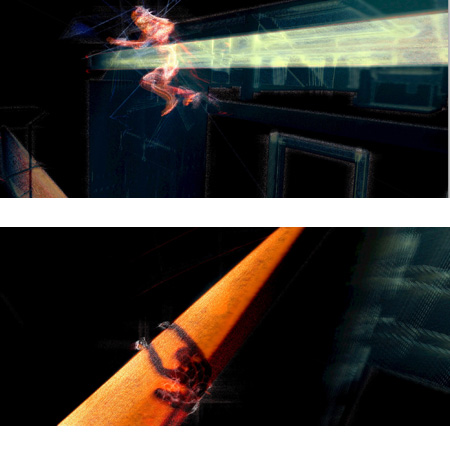 The parkour motions were recorded both with 32 optical motion-capture cameras and with 2 high-definition video cameras (one hand-held, the other on a tripod). The hand-held camera was itself motion-captured so that both its camerawork (itself a kind of performance) and its imagery can be placed seamlessly within the virtual world.