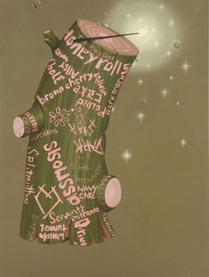 The formal beauty of the paintings - their velvety matte surfaces and rich colors - temporarily disguises the implications of the images. Silhouetted against monochrome backgrounds, the half-eaten leaves, the castrated trees, the piles of rubble - all episodes of destruction - are denied contextual specificity. Standing on their own without a narrative to ground them, these objects and the words inscribed on them are made even more equivocal by the artist's vibrant color choices and his inclusion of fantasy, which imbues the paintings with lightheartedness. The incongruence of the juxtaposed elements ultimately highlights the artist's message: this is a world much like Cinderella's where despondency reigns but hope nevertheless persists.