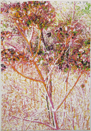 In the oil paintings, bucolic scenes, almost scientific in their dissection of the geography, are juxtaposed with the geometric forms of concrete, urban inclusions in the landscape, which, in turn, seem to melt into the heat-haze hanging over them. Schmidt�s trademark application of paint, deep like bunches of grapes or discarded fruit peel, elevates the everyday into the spectacular, an olive tree glows in the sun, splendid like gold, alongside pastel tones that would be twee but for the muscular interference of that burning, aggressive orange.