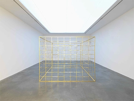 Golden Cage is a cubic construction of four metal surfaces out of which the major part has been extracted in order to only maintain the material needed to obtain a fragile balance. These sheets, which have become fences, are gilded with gold leaf. They seem to have been subjected to a certain covetousness of which they still bear the marks. The 'cage' delimits however a portion of arbitrary space.