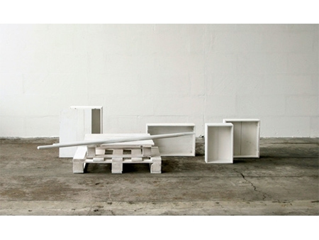 The works which Jan Vercruysse now exhibits, are part of a new series: Places [Lost]. How to initiate a first introduction, a narrative on these new works? A limited set of selected objects constitutes the base for the compositions of these works: a few wooden wine crates�of different shapes and dimensions, two wooden pallets and a pair of billiard cues. These objects are artefacts and they served a specific purpose; they have a �human� history. While a single wine crate, a single pallet or a single pair of billiard cues would be just that, it is in their combination�their compositions�that these objects transcend their primary physical characteristics: they become the remains of a journey, the silent keepers of �parts of lives�. In order to enhance the distance with these primary characteristics, the original artefacts are cast in bronze; these bronzes are thereafter painted with a chalklike white colour or sometimes patinated in the classic way. While the Places [Lost] acquire a sculptural quality�in fact, they even are sculptures�they are their own place.