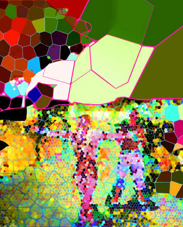 | Daniele Buetti: Oh Boy ! Oh Boy ! April 24th until June 12th 2010 During his visit to the Monreale Cathedral in Palermo, Daniele Buetti was deeply marked � who wouldn't be? � by its mosaics dating from the 12th century that grace the interior's walls. Beyond the aesthetic emotion, he no doubt also recognized a kinship as to form with his own work, which for several years now has integrated qualities of luminous energetic flux, like a ballet of photons on golden backgrounds set down by Byzantine artists. But for his own mosaics, Daniele Buetti had recourse to none of these precious materials. The images � found ones, for the most part � are glued to sheets of Plexiglas, then cut-out by laser into multitude fragments in various shapes and sizes. The compositions, very colourful, are of monumental format and transpose exploded imagery in modern materials. The subjects are not easily decrypted � an effect carefully sought-for by Buetti, who prefers suggestion to overt demonstration, inspired by Christian iconography and more particularly in saintly representations � marked by a form of violence within which transpire submission, repression and subjugation. This idea of constraint is again taken up in a large drawing, one that also marks the transition between the current exhibition and previous works. The suspended human form, hair weighed down by a stone, evokes the morbid iconography of martyrs, in a style both meticulous and cold. Further, a personage who holds between his hands the energy radiating outwards from his body: a retouched photograph, referring as much via its iconography as its technique to digital collages from the series 'Is My Soul Losing Control'. Images attached to outsized placards, faces whose eyes exude a flux of immaterial tears, evoke the light-boxes conceived by Buetti: set to form in an installation at once fragile by virtue of its materials and imposing by virtue of its size, they acquire a quite particular significance. As for the portrait 'overloaded' by an indefinable form, thick matter of oil-colours on photographic paper, it is characteristic of Daniele Buetti's interest for the grotesque and the tragicomic, for the grand human comedy of our existence. The title chosen by the artist for his exhibition is pregnant with ambiguity: 'Oh boy oh boy' � are we to rejoice or lament? PY Desaive Further Information buetti.aeroplastics.net April 24th until June 4th 2010 Exceptionally during ART BRUSSELS: Saturday 24th and Sunday 25th from 09.30 to 18.00 Opening hours: Tue to Fri 11-18.00 Saturday 14-18.00 closed on bank holidays | ||||