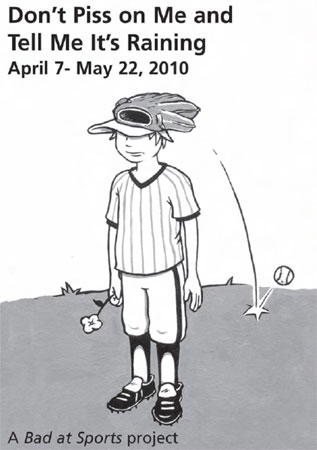 | Don't Piss On Me And Tell Me It's Raining Organized by Bad at Sports April 7 - May 22, 2010 Opening reception: April 7, 6-8pm For the last five years Bad at Sports, a collective based in Chicago, New York, and San Francisco, has attempted to document their art world from the inside. The artists in the collective have logged close to 300 hours of audio interviews and (what might best be described as) reportage, and produced thousands of blog posts and tweets for their site, badatsports.com For their exhibition at apexart, they have assembled a curio cabinet/archive of projects from members of the Bad at Sports galaxy and will give visitors the opportunity to have their questions about the art world answered by the Bad at Sports team. Featuring objects, images and ephemera from and submitted by: Carol Becker, Britton Bertran, Temporary Services, Adam Brooks and Mathew Wilson, Ivan Brunetti, Tom Burtonwood, David Coyle, Death by Design, Elizabeth Chodos, Miguel Cortez, Tony Fitzpatrick, Rob Davis and Michael Langlois, Jeremy Deller, Lisa Dorin, Jim Duignan, Dan Devening, Cody Hudson, Jason Dunda, Fendry Ekel, James Elkins, Anthony Elms, Pete Fagundo, Mary Rachel Fanning,Tony Feher, Rochelle Feinstein, Pamela Fraser, Liam Gillick, Helidon Gjergji, Michelle Grabner, Dylan Graham, Madeleine Grynsztejn, Sarah Guernsey, Terence Hannum, Anni Holm, Brian Holmes, Astrid Honold, Christopher Hudgens, Meg Onli, Amanda Browder, Tom Sanford, Duncan MacKenzie, Christian Kuras, Ben Tanner, Scott Hug, Richard Holland, Carol Jackson, Paddy Johnson, David Jones, Alex Jovanovic, Atsushi Kaga, Mark Staff Brandl, Vera Klement, Peter Saul, Gregory Knight, Monique Meloche, Leo Koenig, Chad Kouri, Steven Lacy, Caroline Picard, Jose Lerma, Laura Letinsky, Kerry James Marshall, Ed Marszewski, Eric May, Dominic Molon, Anne Elizabeth Moore, David Morgan, Julian Myers, Gavin Turk, Liz Nofziger, Jamisen Ogg, Neysa Page-Lieberman, Trevor Paglan, Raymond Pettibon, John Phillips, Allison Peters Quinn, Lane Relyea, Lawrence Rinder, David Robbins, Thomas Robertello, Julie Rodriguez Widholm, Elvia Rodriguez, Nathan Rogers-Madsen, James Rondeau, Marlene Russum Scott, Alison Ruttan, Dan S. Wang, Stephanie Smith, Deb Sokolow, Scott Speh, Chris Sperandio, Lisa Stone, Shannon Stratton, Randall Szott, Christine Tarkowski, Tony Tasset, Tracy Marie Taylor, Ron Terada, Philip von Zweck, Hamza Walker, Chris Walla, John Wanzel, Chris Ware, Oli Watt, Tony Wight, Anne Wilson, Jay Wolke, InCubate, Curtis Mann, Michael Velliquette, Clare Britt, Shannon Stratton, Damian Duffy, William Conger, M N Hutchinson, Mark Francis, Annika Marie, the artists of Blunt Art Text, and more. | ||||