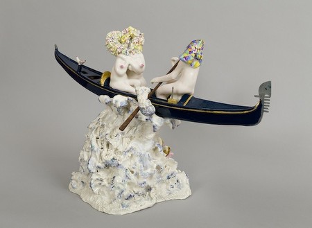 | ANNIE ATTRIDGE WANDERLUST Asya Geisberg Galleryis pleased to present its second solo exhibition with Annie Attridge, Wanderlust. The artist will debut a new series of sculptures and works on paper. A conversation between the gallery and the artist follows. AGG: Your last show "Hearts of Oak" focused on porcelains and charcoal drawings. With "Wanderlust" your work has grown to include stained and carved wood, jade, gold gilt, and pewter. What spurred this multiplicity of elements? Annie Attridge:I really love the idea of finding new materials, and once I do, I become obsessed with getting every detail just so. A lot of the wood came from the destruction and re-gentrification in making the Olympic park: riding my bike past the park, I started to think how I could use those things in my work. Another new element is the geometry - for instance the diamond-patterned harlequin heads, and the obsession with texture - the chunky roses, the dotted coral, the gnarled wood...Can you talk about how this has been introduced? The placement of varying materials and texture create a dialogue of difference. As for the geometry - all of my work is quite direct, but as I get older I want something that embraces structure, and not just wild abandonment and excess. With the harlequin I was interested in how they expose the subtleties of a story, making fun, while cooing at the conveyed lovers, ridiculing the new competitor. There are many recurring sea-based motifs - boats, boobie birds, waves, wood posts that could be sticking out of the ocean. Could you explain your maritime fascination? When I was younger I was brought up in shipping villages, and when I turned 17, I trained to crew sailing ships. When it's 12 o'clock at night and there's no wind, it's really magical--the mythology of the romantic night, of strange ambiguous creatures, fantastical figures. Everything I do is symbolic. The waves represent things that come towards you and you have to fight against what life can throw at you - the sea fluctuates from storm and conflict to reflective calm. You also are very specific in your historical and art historical references. You mentioned the wood-grain woodcut on wallpaper that evokes the paneling of the 1600s, a part of the porcelain's environment. "Cheeky" might be hanging at Versailles. What's your relationship with the past? I always loved watching Greek mythology films, I love all the meanings in the stories, and all those bodies morphing into animals. I use traditional techniques; for me it's a discovery of something old, and keeping it real. I could have had that wallpaper made, but instead I made continuous prints myself. In your studio and in your work, I see a clear influence of Baroque and Rococo sculpture. Your bodies are twisting, limbs become snake-like coils, holding or squeezing bodies, and one body mutates into another, or fuses parts. Is it visual fascination with the movement of the bodies, or an expression of dramatic narratives? When I used to get the lift at the Royal Academy School, I used to always see Laocoon in front of me - it definitely inspired me. When you get close to someone, you entwine, you grow with them and develop a language between you. It's about real intimacy. But it's not always positive...when you feel suppressed in a relationship, you can't be yourself...you want a sense of freedom. All this conversation about relationships, emotions, romance, and yet, a lot of your work has a very naughty sense of humor and a deliberate explicitness that seems to be the opposite of 17th century decorum. Are you purposefully trying to blur sexuality and romance? The bed piece shows an orgiastic overflow of bodies and positions in a Baroque mahogany bed. In "Prologue", a polished jade becomes female buttocks, and manages to balance on a bed of delicate porcelain flowers, refined and romantic, all resting on a twisting organic wood.... But that's where the paradigms come in, hard and soft, geometric, defined structure and organic flow, and the real and the imagined. The wood and stone I made to mimic the twisting porcelain, so they're complementary even though they seem opposite. So you don't see anything shocking in your work? I'm quite open-minded, all these things I've either seen, or are a figment of my imagination, or things I want in the future. What about what Roberta Smith said in her review, that if you were a man making your work you would get into trouble? I would probably. So you agree with her? At the end of the day I love the female form, I love the material, and I create my own alphabet with my porcelain - like using any language and making it your own. Creating them is really sexy. It's all made with real love, like someone who cooks with love -- the taste is divine. You've said that you fell in love with porcelain, and it was love at first sight, or love at first touch. The way you handle the wood, all the different surfaces...you told me "Prologue" has six different pieces of wood. There is a nurturing aspect to handling the material, the sanding, the shellacking...it's very hands-on. When I'm creating my ladies, it's like I'm reliving that moment again. I'm so self-indulgent, I'm making it for my eyes. Annie Attridge was born in 1975 in Wigan, UK. She received a MA from the Royal Academy and BA in Painting from the University of Brighton. Her solo exhibitions include Nettie Horn, London, Galerie 13, Paris, and Prowler Project Space, London. Her work has been included in group exhibitions at Plus Art Projects, London, Galerie Maurer, Frankfurt, the Contemporary Art Society, London, Danielle Arnaud Gallery, London, the Saatchi Gallery, London, and "Grand National - Art from Britain" at the Vestfossen Kunstlaboratorium, Norway. She has received reviews from The New York Times, Channel 4 News, ArtReview, the Evening Standard, and L Magazine, and her work appears in "Design Behind Desire", and will appear in Michael Petry's "Nature Morte" in 2013. She lives and 