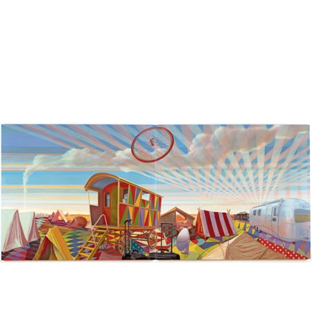 | Greg Drasler: On the Lam September 8 – October 15, 2011 On Thursday September 8, 2011, Betty Cuningham Gallery will open the season with Greg Drasler: On the Lam, an exhibition of new paintings and his third solo show at the gallery. An opening reception for the artist will be held on September 8th, from 6 – 8 PM. Drasler, in these highly polished uncanny paintings, constructs the elsewhere and disruptions of travel as if reinventing the wheel. With auto interiors, patterns and suspended objects, the manifold directions of the imagination is a back seat driver steering into bursts of symbolic coincidence. The objects have the capacity of vehicles and the vehicles are all interior. Littered with cameras, trailers, books, tents and a ski lift, the paintings remain unusually vacant yet preoccupied. This pile up of instruments, tools, patterns and apparel accumulates and reads as words in a sentence, a visual sentence, which is the painting. Taking its title from the largest painting in the show the exhibition insinuates encampment as a destination. On the Lam (70 x 160 inches) is crowded with trailers, tents and wagons that attract with a variety of doors, windows, vents and flaps. In the constructed panoramic sky, complete with camp fire plume, hovers a bicycle wheel, either spun out or loosened from its sprockets. In the place below, where the rubber hits the road, the painting gives us means-to-move and places-to-be. Born in Waukegan, IL, Greg Drasler received a BFA and MFA from the University of Illinois at Champaign/Urbana. He has exhibited regularly in the US since the mid 80's. Widely collected privately, Drasler’ s work can be seen in the collections of Dow Jones, Inc., New York; Krannert Art Museum, Champaign, IL; University of Illinois, Champaign/Urbana, IL; New Museum of Contemporary Art, New York; The Emily Fisher Landau Collection, New York and Thurston Twigg-Smith, Honolulu, HI. Drasler has been the recipient of a National Endowment for the Arts Fellowship in 1993 and a New York Foundation for the Arts Fellowship in 1991. He is currently an Assistant Professor at Pratt Institute and has also taught at Princeton University. The current exhibition will remain on view through October 15, 2011. And it is accompanied by an on-line catalogue at www.bettycuninghamgallery.com. For further information, artist biography, and/or images, please contact the gallery. Betty Cuningham Gallery is located at 541 W 25th St. New York, NY 10001 T: 212.242.2772 F: 212.242.5959 E: [email protected] W: www.bettycuninghamgallery.com Public Transportation: C, E to 23 St Hours: Tues – Sat, 10am – 6pm Next Exhibition: David Bates, October 20- December 3, 2011 | ||||