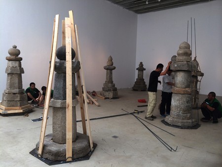 | Zhao Zhao: Uncertainty 2014.5.24 - 2014.7.6 Opening Reception: May 24, 2014, 3:00 - 6:00 PM Chambers Fine Art is pleased to announce the opening on May 24, 2014 of Zhao Zhao: Uncertainty. For his third exhibition at Chambers Fine Art Zhao will present two groups of works, paintings of preserved duck eggs and an installation utilizing Buddhist stupas dating from the Ming dynasty and earlier. Although Zhao Zhao adheres rigorously to his credo of never repeating himself, his diverse body of work is united by an attitude that might be described as simultaneously irreverent and respectful of the past. Zhao Zhao has gained a certain notoriety through the critical edge of his early objects and the political aspects of his magnum opus so far, the monumental 2011 sculpture Officer. At the same time he has produced works such as Again, 2012, exhibited at the Ullens Center for Contemporary Art (UCCA), that show a deep respect for aspects of traditional Chinese religion and culture, however drastic the measures he takes to preserve them might seem. Again, now part of the Ullens’ permanent collection, is a large cubic form made from blocks of stone carved from fragmentary Buddhist sculptures from which the remaining projecting parts have been cut off. However, this monumental stone cube resembles other works of minimal sculpture only in its superficial aspects. In contrast, the Buddhist stone stupas that Zhao Zhao has gathered in Uncertainty are presented in essentially unmodified form although the separate stones that are piled on top of each other require external support in the form of metal scaffolding, wooden beams, rebar, rope etc. to prevent them from toppling over. For Zhao Zhao these deeply symbolic forms, propped up and rather forlorn in their new context, find parallels in Chinese society today in which uncertainty has replaced the philosophical, religious and even political certainties that used to prevail. Removed from their original settings and displayed in such a precarious condition, the stupas have been drained of their ability to inspire quiet meditation, although the beauty of their forms and the powerful response they evoke in the viewer is equally as profound. In complete contrast to the stupas, in a new series of intimate paintings Zhao Zhao takes as his theme the duck eggs salted in brine or damp salted charcoal that are a favorite Chinese foodstuff. As with many aspects of life in China, these humble eggs have a long provenance, records for preparing them having been found dating from the Han dynasty (206 BC – 220 AD). In addition, the deep orange - red color of the yolks makes them perfect symbols for the moon in Chinese moon-cakes. However, Zhao Zhao wears his learning lightly and the sequence of small paintings in which slices of salted duck egg float on an inky black background is endearingly absurd. Here another kind of uncertainty prevails, speculation as to the meaning of this unexpected presentation of a frequently encountered delicacy that is consumed without thinking. In the rush to modernity, the superficial pleasures of consumerism have resulted in mindless destruction and heedless forgetfulness of more traditional values and ways of thinking. As the visitor moved between the gallery of salted duck eggs and the forest of stupas, the impressions formed and questions raised in one gallery inevitably affect his/her experience in the other. There is a riddle to be solved, it seems, but it is up to the visitor to find the answer! The artist can only point the way. For more information, please contact the gallery at +86 (0)10 5127 3298 or [email protected] | ||||