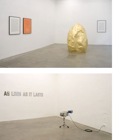 | CHRISTINE K�NIG GALERIE, ENGHOLM ENGELHORN GALERIE, GEORG KARGL FINE ARTS and GABRIELE SENN GALERIE cordially invite you to the opening of the exhibition curated by_vienna 09 Beginnings, Middles, And Ends Curator: Gianni Jetzer, New York Opening: Friday, May 8, 2009, 6 - 12 pm Duration of the exhibition: May 9 - June 13, 2009 Lecture Matthew Higgs and Gianni Jetzer Tuesday, May 5, 2009, 5 p.m. Depot, Breitegasse 3, 1070 Vienna Panel Fractured Narrative Thursday, May 7, 2009, 2 p.m departure lounge, VIENNAFAIR 09, hall A Diana Baldon (moderation) D�ra Hegyi J�rg Huber Gianni Jetzer Roberto Ohrt Beginnings, Middles, And Ends Luke Butler, Annelise Coste, Ceal Floyer, Douglas Gordon, Amy Granat, Matthew Higgs, Gabriel Kuri, J�rg Lehni, Louise Lawler, J�n Man�u�ka, Kris Martin, Olivier Mosset, Marlo Pascual, Mai-Thu Perret, Alex Rich, Valentin Ruhry, Gedi Sibony, William Stone, Lawrence Weiner, Andro Wekua, Guido van der Werve Once there was a little boy and everything turned out alright. THE END Louise Lawler Narration has long since been the common denominator of art and writing. But artists do not always make a point of telling the whole story. Art aims at the untellable, the untold; it dwells in the absence of action, exposing such quintessence as is lost in the transit from first word to last. Beginnings, Middles, And Ends brings together works for which the narrative fragment is the primary unit of measure. The exhibition presents image sequences, abstract forms, film sequences, single words or - as an exception - sentences in their entirety; story is reduced to its simplest component parts, without, however, referring to an overarching whole. Under the sign of the fragment, the work of art comes to resemble certain classical sculptures of the human torso, which, lacking organs of mobility and sight, confront us with the paradox of a unity or wholeness premised upon partiality and absence. Louise Lawler's work Once there was a little boy plays on the promise of totality implied by traditional narration. A two-sentence story with definite start- and endpoints, Once there was a little boy summarizes a life in the most lapidary way possible. Lacking a definite middle, Lawler's fictional frame rejects the specificity of traditional storytelling; the boy in question disappears as soon as he is introduced. Indeed, the ending seems quite solemn, following from no definite storyline, no dramatic chain of events. In the exhibition, Lawler's use of monochrome wall paint and her ostentatious application of letters accentuate the story's perplexing brevity. The terrain charted in Beginnings, Middles, And Ends is not to be reached by straightforward means. Here, narrative finds itself fragmented, and fragments about each other in turn, objects, sentences, and ideas in unruly order - a syntax of discontinuity and false starts. The exhibition extends over four gallery rooms and is based entirely on such fragments. Intentionally, there is no defined sequence. The untold is, in this sense, a quantity as well as a quality: for every path towards narrative, there is also a path in the reverse direction, along which lies the image of what goes unsaid. | ||||