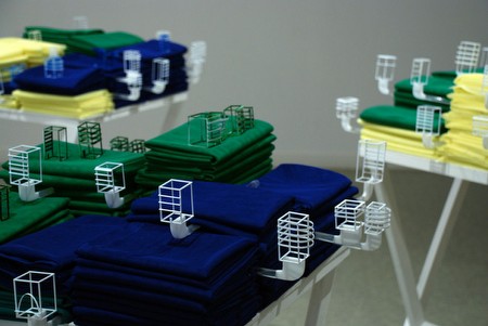 | MARIE LELOUCHE Exposition personnelle en deux volets #2 Variation in building Du 16 au 25 février 2012 À l’occasion de ce deuxième volet intitulé Variation in building, Marie Lelouche présente un ensemble de pièces – installations et dessins – créées lors de sa résidence à Goyang en 2010. Cette ville s’est considérablement développée suite à l’essor économique sans précédent de ces cinquante dernières années. L’évolution démographique et l’exode de la population vers la capitale ont engendré une construction de masse de barres d’immeubles de type occidental. Lors de la construction de tels bâtiments, des protections anti-poussière de différentes couleurs sont utilisées et curieusement organisées en bandes colorées, ce qui confère aux édifices un aspect étrange, presque fantomatique. On retrouve ce type d’ornementation, par organisation des couleurs, dans l’architecture traditionnelle coréenne. Marie Lelouche a choisi d’utiliser ces bandes dans son installation Variation in building, leur attribuant ainsi une réelle valeur plastique. Suspendues aux murs tels des rideaux devant une infinité de fenêtres aveugles ou délicatement organisées en piles de couleur sur des socles blancs, elles évoquent de façon fluide et imagée ces constructions ainsi que l’évolution démographique coréenne. « Ces pans de tissu sont comme une rémanence culturelle. Celle-ci, présente dans le processus de construction, est invisible sur le bâtiment fini. » De la mégalopole coréenne, Marie Lelouche a choisi de retenir un objet bien particulier qui, à lui seul, évoque tant l’évolution majeure du pays en termes de construction et de développement, que la mémoire et la spécificité locale. L’installation, ainsi que les dessins réalisés au feutre fin révèlent une structure urbaine idéelle, fondée sur le renouvellement inconscient des traditions. - Coming back from South Korea, Marie Lelouche sweeps Alberta Pane Gallery with a double exhibition, inspired from her stay in the Land of the Morning Calm, (Goyang Art Studio 2010 and Nanji art studio 2011). This young French artist, born in 1984 and graduated in 2008 from Ensba, is specialized in the sophisticated arts of blown glass and porcelain, which she combined to raw materials, such as fabric or wood, by questioning the material limits to derive unequaled shapes. During her travels, Marie Lelouche plunges herself into cultural and social contexts very far from what she usually knows, in order to actively influence her artistic practice. Real exote − as Victor Segalen defined it − the artist experiences the different and the "other" to reach a full freedom in the observation of the object she will describe or just feel. The participating observance and the experience, as means of creation, are at the heart of her artistic practice For the second section of the exhibition (Variation in Building), Marie Lelouche presents a set of pieces − installations and drawings − produced during her stay in Goyang, in 2010. This city belongs to the megalopolis of Seoul, noticeably developed after its enormous economic growth, during the last fifty years. The population increase and the exodus towards the capital, brought a mass construction of several occidental structure covered, while building, by anti−dust barriers. These, divided in colored slashes, generated a strange frame: nearly imaginary buildings. This kind of colored decoration could also be seen in traditional Korean architectures. Marie Lelouche has chosen to use these slashes in her installation Variation in Building, by giving them a real, plastic value. Hanging from the wall − as curtains hiding infinite, blind windows − or gently divided in colored piles on a white socle, they fluently and visionary evoke those buildings and the Korean population increase. "These tissue panels are like cultural persistences. Being part of the construction process, they are invisible in the finalized building." From the Korean megalopolis, Marie Lelouche keep only a specific object that can, by itself, remind both the country development − expressed by the proliferation of buildings − and heritage through the South Korean characteristics. The installation and the drawing (thin felt − tip pen) inspired an ideal urban structure, made upon the unconscious renewal of traditions. | ||||