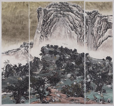 Yang Jiechang, Tale of the 11th Day, Mid-Autumn, 2011 Ink and mineral colours on silk, mounted on paper and canvas 104,33 x 111,81 in (Photo David Bordes) | |||