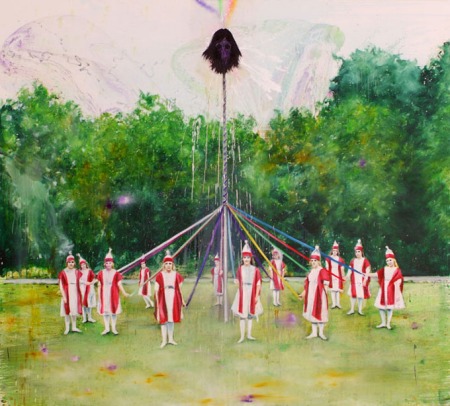 | Till Gerhard Glaube, Hoffnung und Liebe Although the scenes depicted in Till Gerhard's pictures appear to create an impression of reassuring cosiness, prima facie at least, they elicit a sense of unease when viewed at closer range. Ostensibly harmless prints, based on photographs depicting young people at festivals and atmospheric sunsets, are infused with ominous undertones in terms of their artistic execution via deformed faces, dark, sinister skies and the spectral hovering of mysterious luminous entities. Gerhard ousts these hippy icons from their pedestal of 1960s tranquillity by means of a casual artistic gesture in clear tones, causing them to topple into the here and now via an impalpable shift into the uncanny. Till Gerhard (born 1971) lives and works in Hamburg, where he studied painting until 1998. His works have featured in many exhibitions, including those at the Kunsthalle Hamburg and at the Saatchi Gallery London. After a solo exhibition at the Cologne branch in 2006, the Michael Janssen Gallery now looks forward to hosting Till Gerhard's second solo show in Berlin. Die Szenen in Till Gerhards Bildern m�gen auf den ersten Blick durchaus gem�tlich wirken, sp�testens auf den zweiten l�sen sie Unbehagen aus. Vordergr�ndig harmlose Fotovorlagen von jungen Menschen auf Festivals und vor stimmungsvollen Sonnenunterg�ngen bekommen in der malerischen Umsetzung durch deformierte Gesichter, dunkel dr�uende Himmel und geisterhaft schwebende Leuchtwesen einen bedrohlichen Unterton. Mit lockerem Malgestus in luziden T�nen l�sst Gerhard die Ikonen einer Hippie-Beschaulichkeit von den Sechziger Jahren bis in die Jetztzeit durch kaum merkliche Verschiebungen ins Unheimliche kippen. Till Gerhard (1971) lebt und arbeitet in Hamburg, wo er bis 1998 Malerei studiert hat. Er war unter anderem an Ausstellungen in der Hamburger Kunsthalle und in der Saatchi Gallery London beteiligt. Nach einer Einzelausstellung 2006 in den K�lner R�umen freut sich die Galerie Michael Janssen, nun Till Gerhards zweite Soloshow in Berlin auszurichten. Jin Meyerson progress is no longer a guarantee Jin Meyerson, self-confessed visual junkie and part of an artistic generation which grew up under the influence of mass media, collects the flotsam and jetsam of a daily flow of images and filters it back onto canvas via the cosmos of his private existence. Intricate, distorted motifs of natural catastrophes like the devastating hurricane, 'Katrina', the 9/11 attacks on the World Trade Center and images from the war in Afghanistan trigger nightmarish memories of collective horror and paralysing helplessness with their lurid, CNN aesthetics. Jin Meyerson, born in South Korea in 1972 and raised in the USA, lives and works in New York and Paris. In recent years, his pictures have been exhibited at many international institutes and galleries, including the Chelsea Art Museum NY and the Saatchi Gallery London. Michael Janssen is proud to present Jin Meyerson's first solo exhibition in Germany. Jin Meyerson, bekennender visual Junkie und Teil einer mit Massenmedien aufgewachsenen Generation von K�nstlern, sammelt das Treibgut der t�glichen Bilderflut und schickt es, durch den Kosmos seiner privaten Existenz gefiltert zur�ck auf die Leinwand. Die perspektivisch verzerrten und verschlungenen Motive von Naturkatastrophen wie dem verheerenden Sturm �Katrina�, den Angriffen auf das World Trade Center oder aus dem Afghanistankrieg wecken in ihrer grellen CNN-�sthetik beklemmende Erinnerungen an kollektives Entsetzen und l�hmende Hilflosigkeit. Jin Meyerson, 1972 in S�dkorea geboren und in den USA aufgewachsen, lebt und arbeitet in New York und Paris. Seine Bilder sind in den letzten Jahren in internationalen Institutionen und Galerien, darunter dem Chelsea Art Museum NY und der Saatchi Gallery London, gezeigt worden. Michael Janssen freut sich, Jin Meyersons erste Einzelausstellung in Deutschland zu pr�sentieren. | ||||