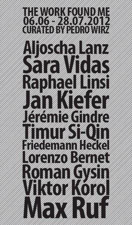 | THE WORK FOUND ME curated by Pedro Wirz Aljoscha Lanz Sara Vidas Raphael Linsi Jan Kiefer Jérémie Gindre Timur Si-Qin Friedemann Heckel Lorenzo Bernet Roman Gysin Viktor Korol Max Ruf 06.06.2012 - 28.07.2012 | ||||
