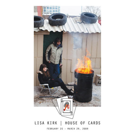 In the current economic crisis, Americans have been forced to reckon directly with the anxious and guilt-ridden underbelly of the late-capitalist system that has, for several generations, sustained us. For the last decade, Lisa Kirk has produced bold multi-media work and environmental installations that explore the spectacle of capitalism, terrorism and political violence. Her exhibition House of Cards offers a familiar yet deconstructed vision, drawn from our collective nightmare of a post-capitalist future. The work, maison des cartes, a show model �shanty timeshare� built from 52 separate pieces of found materials, will occupy the central space of the gallery, and will continue by transforming the gallery�s office into a functioning real estate salesroom complete with salespeople. There, viewers will be presented with the chance to buy into the private residence club. Upon the show�s completion, the structure will be rebuilt in a new location where shareholders will have the opportunity to experience shanty living. After 52 weeks, maison des cartes will be disassembled and distributed to the shareholders as 52 separate and unique artworks.