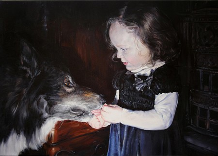 But we do not descend into these visions completely, for their technical execution is also significant. The jewel-like colours and lush shadows convey the marks of the maker – brush strokes are always evident. Their presence reminds us that we are involved in painterly acts of representation and interpretation. Cienski says; ‘I do not want paintings to imitate photography. I am keen on remaining true to the medium of oil paint that enables a creation of an independent, parallel reality on canvas with painterly means’.