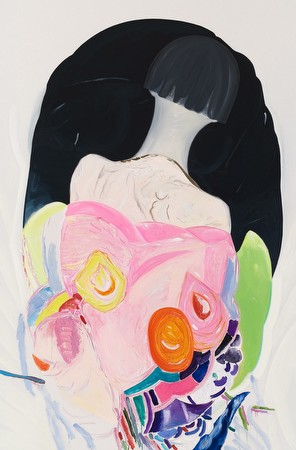 Trained at the Academy of Art Düsseldorf, K.E.’s dynamic process involves both abstracted, stylized compositions such as those on display, as well as earlier conceptual paintings works whose appropriation of media imagery and wit recalls the Capitalist Realist practices of artists like Sigmar Polke and Martin Kippenberger. Boris Groys writes about K.E. that she “is a stroller with a sure- footed, purely private view, consuming the images of the media world in a melancholy and ironic way.” K.E.’s recent works depart from this better-known visual language. Instead, the floating compositions are ordered by their own rules, and only a small fragment of these systems is made visible. Departing from the clear referents of her earlier appropriations, K.E. freely crafts vibrant planes of colors and intricate details, constructing images of immense substance that resist easy understanding and immediate comprehension. Rather, they draw from just beyond our reach, from “the day after the future.” In this inaccessibility, the material sensuality of this transcendent world is made clear as autonomous, but perilous.