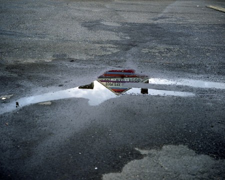 Continuing her investigation of escapist and fantastical spaces, Kereszi has trained her eye on the gritty, abandoned sites of former amusement parks, strip clubs, theaters, and other entertainment locales. The works offer subtle visual hints of a once happier existence, using windows and reflections, for example, as metaphorical portals to escape a reality of decay. Though subdued in tone and content, the work is also a celebration of the magic of the purely photographic. Reactive, though quiet, Kereszi’s photos are not pre-conceived or planned out, but rather genuine, instinctive responses to strange, silent and secret beauty. In Topless bar reflected in puddle, Doylestown, PA, Kereszi frames a sliver of the defunct club’s sign in a parking lot puddle, which forms the shape of an arrow and reflects the club’s essential message – Topless Motel Bar Food. The building’s A-frame roof and chimney suggest that this is a former home converted to a strip club, another subtle reminder of the distressed conditions to which Kereszi lends her poetic sensibility.