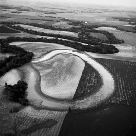 Having photographed the ecology of the prairie floor from ground level for several years, Evans determined that the story of the land was incomplete without a macroscopic perspective of what she described as the “disturbed, cultivated, militarized” prairie. In 1990, Evans began taking flights in a 25-mile radius around her home in Salina, Kansas, cataloguing the farms, flooded fields, cemeteries, ancient Indian village sites, highways, train tracks, bridges, military sites, cattle ranches and industrial gravel pits comprising the land below. Flying at 700 to 1000 feet, Evans could read specific pieces of visual information on the ground, without the entire landscape veering into abstraction. This distinction is critical to Evans’ practice, and it allowed for her unflinching look at the relationship between human intervention and the natural prairie. As Evans writes: “The thing I love the most was learning to read the landscape history from the air. I felt I was acquiring a sort of visual literacy of the ground. It was about reading the clues that told me whether or not the ground had ever been plowed, where the cemeteries were, what part was military, and what the history of all those markings meant.”