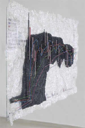 The CORPORATE CHARTS SERIES (2008 - 2009) examines themes of faltering economies and environmental deterioration. Stamatiou attacks the corporate mentality with an art of unconventional materials and style, focusing on charts as systems of classification. To recreate the stock price charts of two �penny stock� companies producing alternative energy (BLVD) and biotechnology (PLSO), he builds elaborate collages with found objects of consumer waste � plastic water bottles, plastic drinking straws and electrical wires. In the light box titled CEO, Putting Pay For Performance First (analysis of 2006 compensation for top executives of major US corporations) he reuses glass from a broken window of a bank where he saw the original chart.