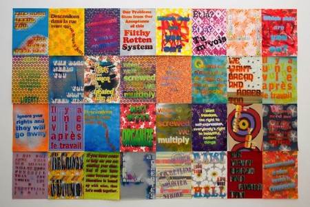 | Andrea Bowers, Workers' Rights Posters, 2013 spray paint on giftwrapping paper, 32-24 x 18 inches Image courtesy of the artist and Andrew Kreps Gallery, New York | |||